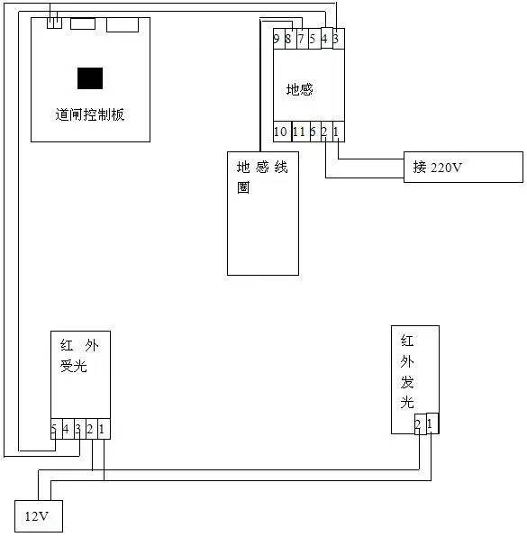 看了上面的示意图,我们知道是地感线圈感应车出现的问题,至于怎么会出现这个问题,我们先简单的介绍一下道闸与地感的工作原理,下面是连接示意图.