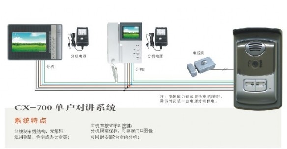 CX-700别墅可视对讲系统采用“1+1”布线结构,使分机隔离,无串音、误开锁现象发生,系统使用更加安全。(市面别墅对讲系统常见的通病有:分机手柄未挂好,导致漏音,即在门口主机处能听到室内说话或电视的声音;随意性按开锁键导致大门电控锁误开锁等)